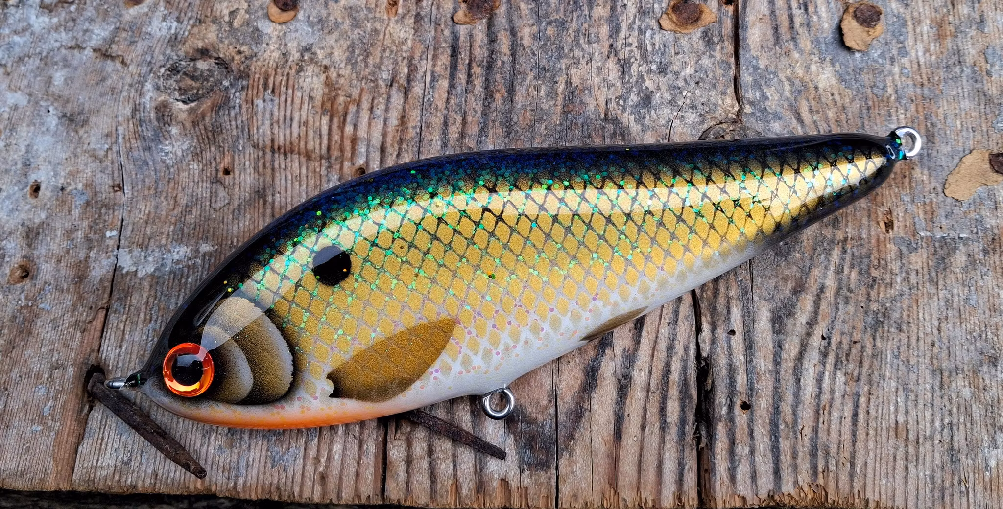 The 'Big Belly Up' are a big (21cm long and weighs 160gr) sinking swimbait/gliding jerkbait with really bigpike-movement. It just moves big. Big s-turns on retrieve. Big glides wide to the sides on jerk. Big wiggle in the body while it sinks and big heavy rattlechamber who klicks nice meanwhile. Short frequent jerks/taps and it gets a irratic behavior like the old classic 'The Pig'. But the thing I like the most with this lure are that it doesn‘t stops on stop!?.. A lot of swimbaits has such a distinct swimming side to side action so when you suddenly stop it just turns steep and stops. This Big Belly Up just keeps on gliding in that dirrection it was going on a super realistic way, like a fish who hits with the fins while swimming and then glides. And when the lure looses its speed it begins to sink with heavy wiggles.
